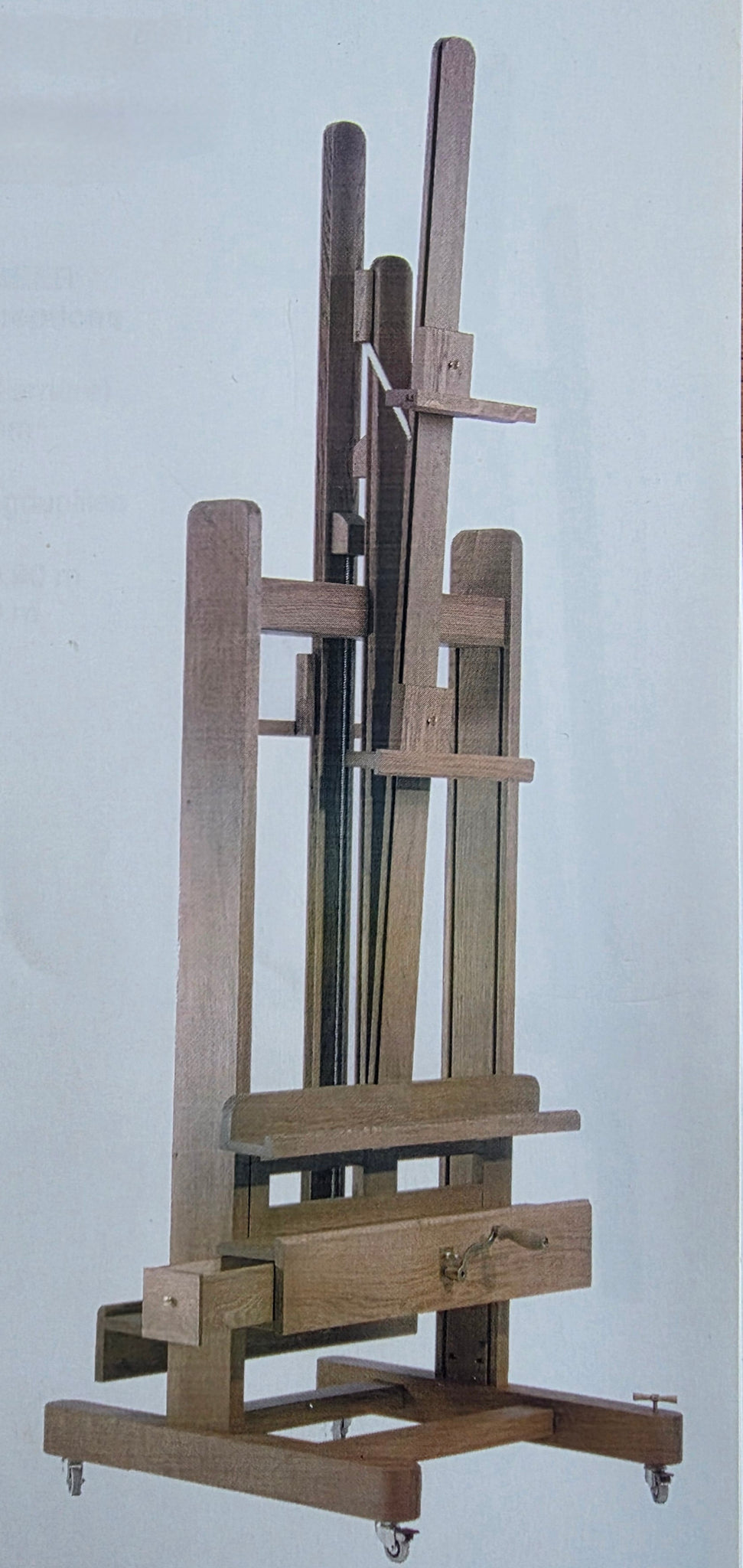Ces chevalets conçus pour les professionnels sont de fabrication artisanal, robuste et soignée. La tablette supportant la toile, se monte à l'aide d'une vis sans fin actionnée par une manivelle.